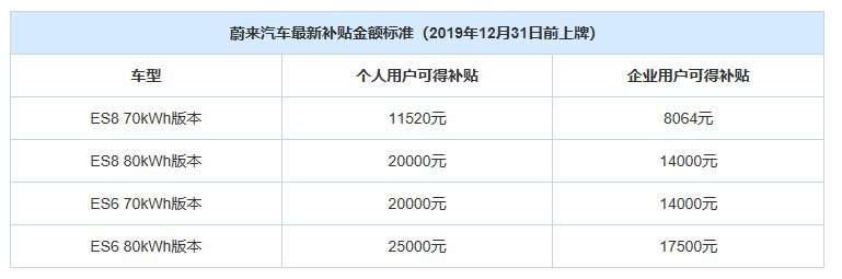自2019年7月1日起,購買70kWh版本ES8并在2019年12月31日前上牌的個人用戶可享11520元補貼,企業(yè)用戶可享8064元補貼;購買84kWh版本ES8的個人用戶可享2萬元補貼,企業(yè)用戶可享1.4萬元補貼。同時2019年7月1日起,購買70kWh版本ES6并在2019年12月31日前上牌的個人用戶可享2萬元補貼,企業(yè)用戶可享1.4萬元補貼;購買84kWh版本ES6的個人用戶可享2.5萬元補貼,企業(yè)用戶可享1.75萬元補貼。