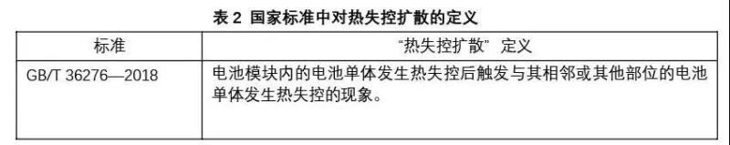 熱失控電池產(chǎn)生的熱量高于它可以消散的熱量時(shí),熱量進(jìn)一步積累,可能導(dǎo)致火災(zāi),爆炸和氣體釋放。如果電池系統(tǒng)中,由于一個(gè)電芯產(chǎn)生熱失控而引發(fā)其他電芯熱失控,即為熱失控?cái)U(kuò)散。國(guó)家標(biāo)準(zhǔn)GB/T 36276—2018中給出的熱失控?cái)U(kuò)散定義如表2所示。