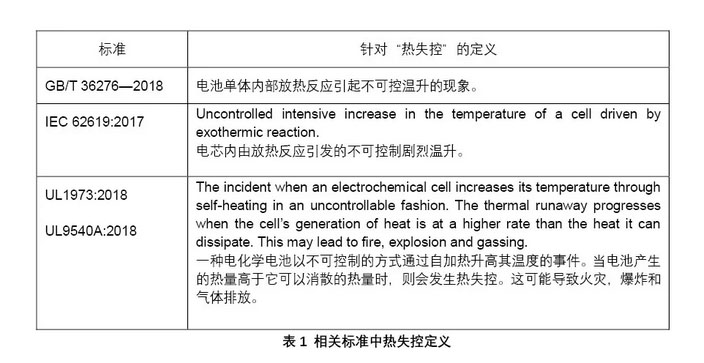 電化學(xué)電池以不可控制的方式通過(guò)自加熱升高其溫度的事故即為熱失控。目前,多個(gè)標(biāo)準(zhǔn)中都有針對(duì)熱失控的定義,見(jiàn)表1▼