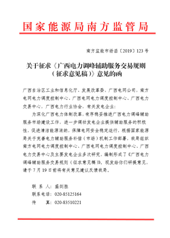 關(guān)于征求《廣西電力調(diào)峰輔助服務(wù)交易規(guī)則(征求意見稿)》意見的函