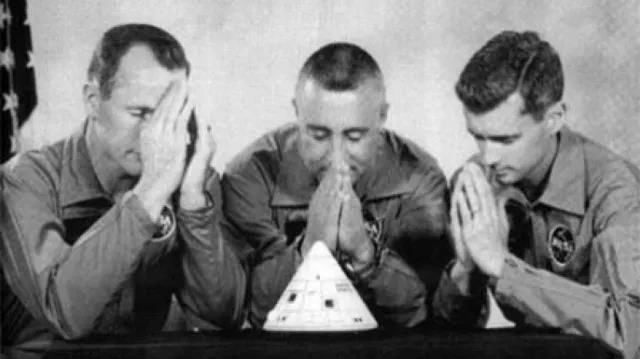 阿波羅1號飛行前三名宇航員對著飛船模型祈禱