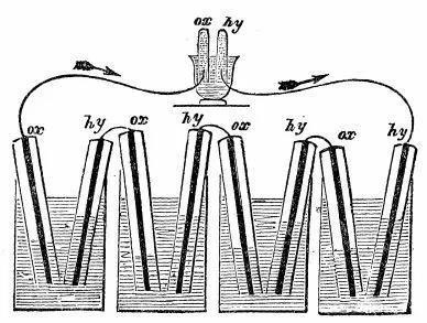 葛洛夫初代燃料電池草圖:氫氣、氧氣、鉑片、硫酸
