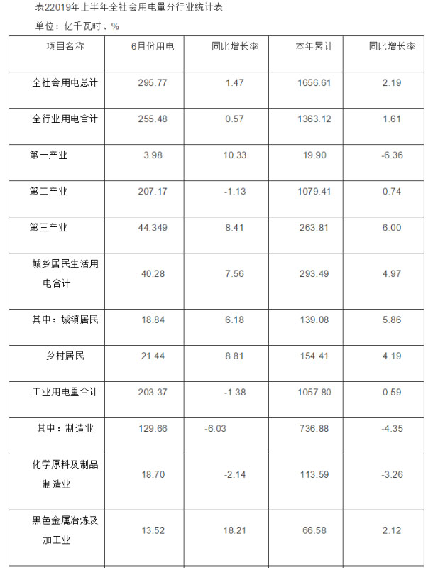 (一)全社會用電量情況。全省全社會用電量295.77億千瓦時,同比增長1.47%;截止6月底,累計用電量1656.61億千瓦時,同比增長2.19 %。