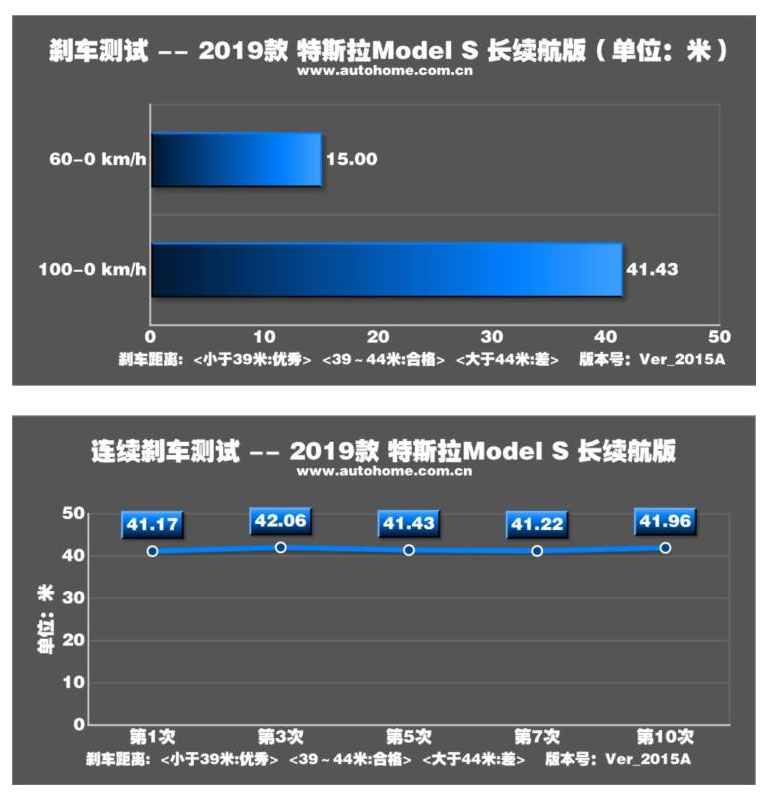 相較之下這臺(tái)車的制動(dòng)表現(xiàn)比較一般,定位全季胎的固特異Eagle Touring在緊急制動(dòng)狀態(tài)下抓地力略顯不足,再加上超過(guò)2噸的沉重車身帶來(lái)的巨大慣性,最終2019款特斯拉Model S長(zhǎng)續(xù)航版100-0km/h的平均剎車成績(jī)?yōu)?1.43m;不過(guò)連續(xù)極限制動(dòng)操作下,這臺(tái)車的制動(dòng)成績(jī)卻沒(méi)有出現(xiàn)明顯衰減,還是穩(wěn)定的維持在41m-42m之間。
