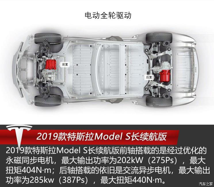 2019款特斯拉Model S長(zhǎng)續(xù)航版前軸搭載的是一臺(tái)經(jīng)過(guò)優(yōu)化的永磁同步電機(jī),最大輸出功率為202kW(275Ps),最大扭矩404N·m;后軸搭載的依舊是交流異步電機(jī),最大輸出功率為285kw(387Ps),最大扭矩440N·m;與電動(dòng)機(jī)匹配的是固定齒比的單速變速箱;電池包電量依舊為100kWh,被平鋪于車輛底部,起到了降低車輛重心,提升行駛穩(wěn)定性的效果。