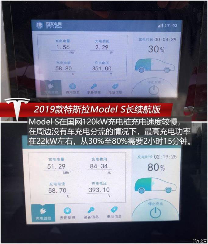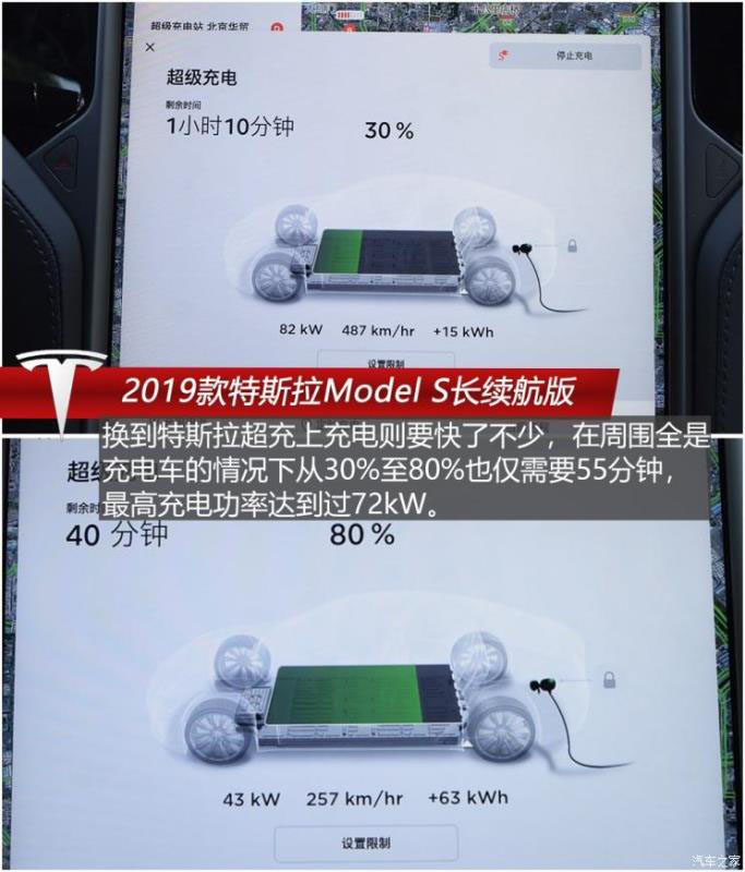 之后我們?cè)趪?guó)網(wǎng)直流120kW充電樁為Model S充電,不過(guò)在充電過(guò)程中我們發(fā)現(xiàn)這臺(tái)車與國(guó)網(wǎng)直流充電樁兼容性較差,充電速度遠(yuǎn)低于在超級(jí)充電樁充電的速度,在周邊沒(méi)有什么車充電分流的情況下,最高充電功率也僅有22kW左右,從30%至80%需要2小時(shí)15分鐘,而且在兩處距離甚遠(yuǎn)的國(guó)網(wǎng)充電站充電速度都差不多;換到特斯拉超充則要快了不少,在周圍全是充電車的情況下從30%至80%也僅需要55分鐘,最高充電功率達(dá)到過(guò)72kW。
