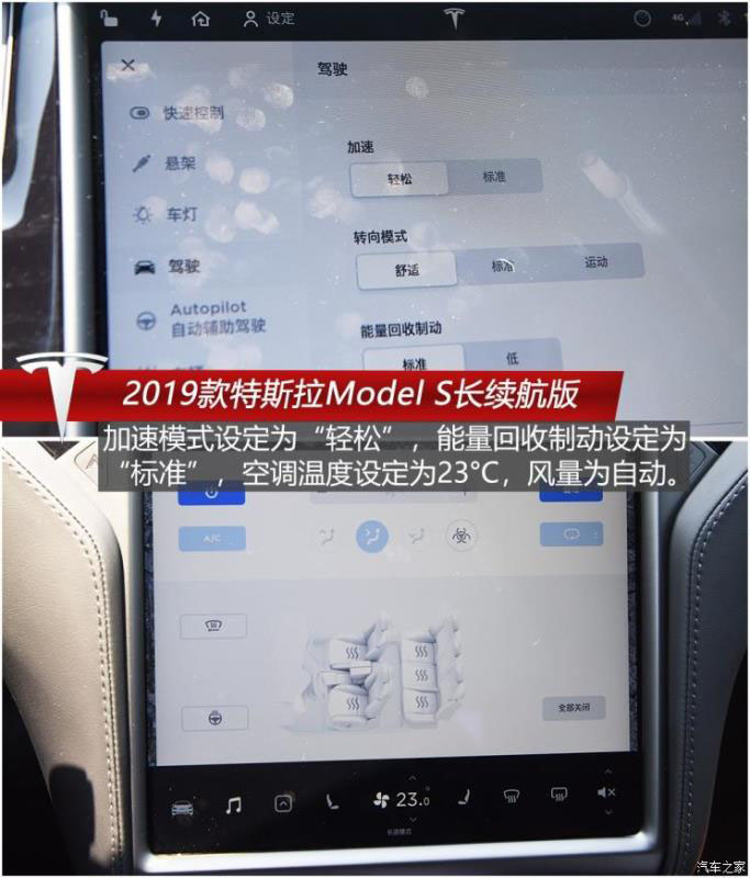 Model S的舒適性還體現(xiàn)在能量回收的設(shè)定上,同樣是兩擋設(shè)定,“低”擋位下松開(kāi)加速踏板并不會(huì)有明顯的拖拽感,動(dòng)能回收力度柔和細(xì)膩;“標(biāo)準(zhǔn)”模式下拖拽感及減速效果會(huì)更強(qiáng),但也在可接受范圍內(nèi),不至于讓人有不適之感。