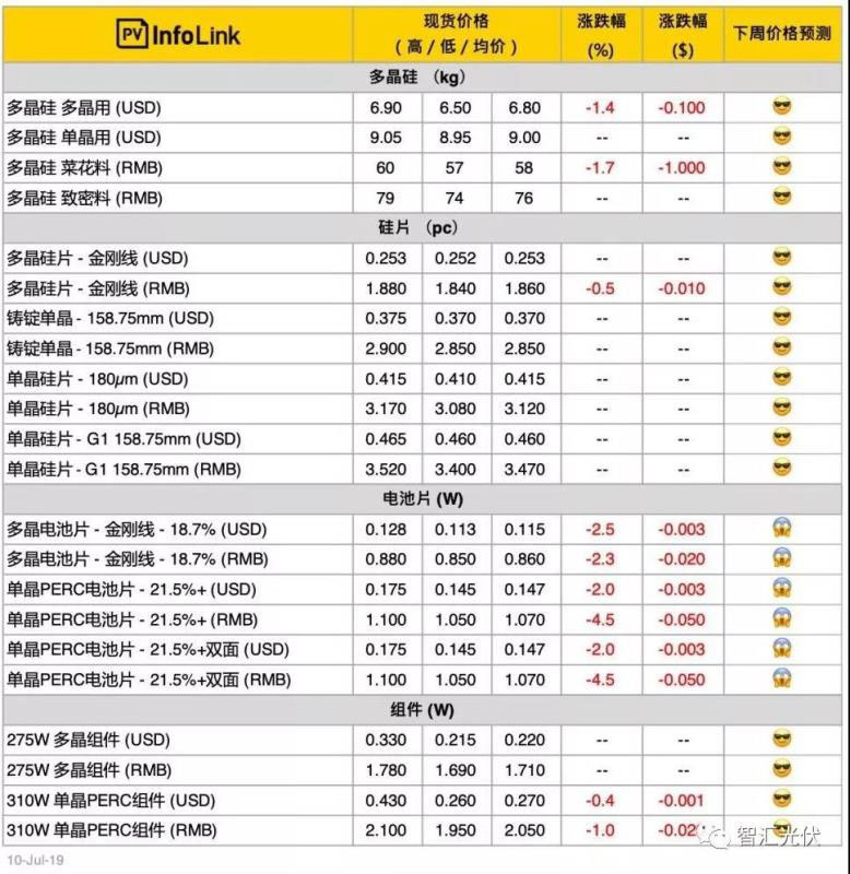 在電池片下跌的帶動下,單晶PERC組件價格也持續(xù)走低;多晶電池片小幅下降。