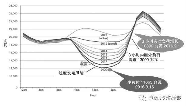 間歇性可再生能源的大量滲透,尤其是太陽(yáng)能,對(duì)加州的電力系統(tǒng)帶來(lái)了很大的挑戰(zhàn)。下圖是加州批發(fā)電力市場(chǎng)運(yùn)營(yíng)系統(tǒng)CAISO從2012年到2020年實(shí)際和預(yù)測(cè)的在某一日的凈負(fù)荷變化。由于太陽(yáng)能在白天的出力迅速增加,在中午12時(shí)~下午3時(shí)系統(tǒng)的凈負(fù)荷變得很低,這時(shí)系統(tǒng)面臨非常大的出力過(guò)多風(fēng)險(xiǎn)。但在下午3時(shí)~7時(shí)左右,因?yàn)樘?yáng)能的出力迅速降低,系統(tǒng)凈負(fù)荷迅速增長(zhǎng),系統(tǒng)又面臨沒(méi)有足夠的資源來(lái)滿(mǎn)足出力增長(zhǎng)的需求。凈負(fù)荷在一天之內(nèi)這樣大幅度變化充分說(shuō)明加州需要有非常靈活的資源來(lái)及時(shí)的應(yīng)對(duì)風(fēng)電和太陽(yáng)能帶來(lái)的變化。