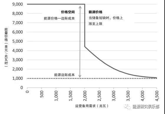 ERCOT在每個(gè)季節(jié)對(duì)于這兩種輔助服務(wù)產(chǎn)品都分別制定出6條ORDC曲線(xiàn),即把每天24小時(shí)按每4小時(shí)分成一個(gè)時(shí)段,共6個(gè)時(shí)段。對(duì)每個(gè)時(shí)段,ERCOT對(duì)系統(tǒng)在一定儲(chǔ)備量的情況下估算負(fù)荷損失概率,然后將負(fù)荷損失概率乘以損失負(fù)荷的價(jià)值(在ERCOT這個(gè)損失負(fù)荷的價(jià)值是9000美元/兆瓦時(shí))從而得到ORDC曲線(xiàn)。輔助服務(wù)產(chǎn)品的價(jià)格是ORDC的曲線(xiàn)減去邊際能量市場(chǎng)的價(jià)格。如下圖所示,當(dāng)儲(chǔ)備過(guò)剩時(shí),由于負(fù)載損失概率較低,儲(chǔ)備的價(jià)格很低,接近零。當(dāng)儲(chǔ)備短缺時(shí),由于負(fù)載損失很高,價(jià)格很高。當(dāng)儲(chǔ)備少于2000兆瓦時(shí),電力市場(chǎng)的價(jià)格就會(huì)達(dá)到市場(chǎng)價(jià)格的最大值9000美元/兆瓦時(shí)。假設(shè)當(dāng)時(shí)市場(chǎng)的能源邊際成本是1000美元/兆瓦時(shí)的話(huà),這意味著提供輔助服務(wù)的資源可以得到8000美元/兆瓦時(shí)的價(jià)格。