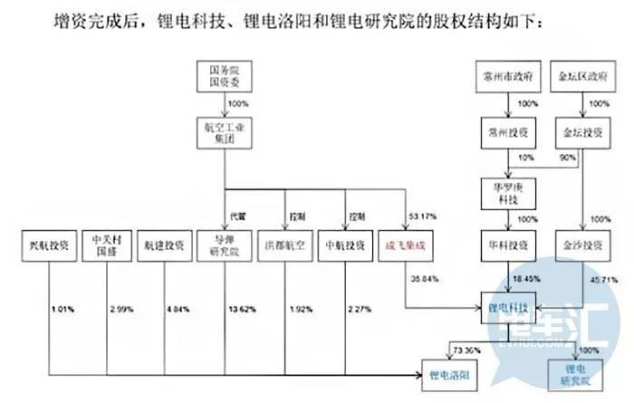 而本次交易后,成飛集成將與鋰電科技30%股權(quán)等價值的鋰電洛陽 45.00% 股權(quán)轉(zhuǎn)讓至鋰電科技。上述股權(quán)轉(zhuǎn)讓完成后,鋰電科技擬修改《公司章程》,并改選董事會,成飛集成不再控制鋰電科技(以及其控制的鋰電洛陽),金沙投資將控股鋰電科技(以及其控制的鋰電洛陽),金壇區(qū)政府通過金沙投資、華科投資合計持有鋰電科技 70%股權(quán),成為鋰電科技實際控制人。成飛集成將其持有的剩余18.98%鋰電洛陽股權(quán)與35%鋰電研究院股權(quán)、金沙投資將其持有的9.38%鋰電洛陽股權(quán)(由航空工業(yè)集團(tuán)無償劃轉(zhuǎn)而來)、華科投資將其持有的65%鋰電研究院股權(quán)對鋰電科技進(jìn)行增資。