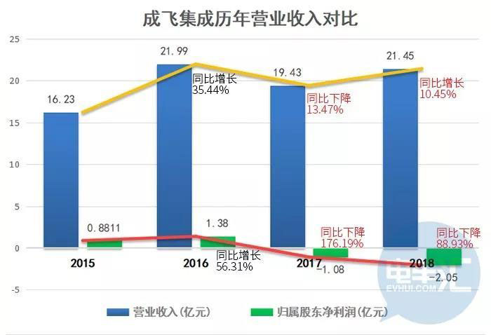 而與之相伴的事實亦顯得順理成章,2014年開始,受新能源汽車行業(yè)持續(xù)發(fā)展的主觀影響,成飛集成的鋰電業(yè)務(wù)快速發(fā)展并成為了上市公司的主要收入板塊之一。2015年~2016年,成飛集成分別完成營收16.2億元和22億元,凈利潤分別大幅增長至8811萬元和1.38億元。到2016年,成飛集成的鋰電池業(yè)務(wù)已成為了上市公司的的主營業(yè)務(wù),但這樣的高速增長僅持續(xù)了兩年。根據(jù)成飛集成上市公司2017年財報顯示,受鋰電業(yè)務(wù)發(fā)展不暢影響,2017年成飛集成實現(xiàn)營業(yè)收入19.43億元,同比下降13.47%;實現(xiàn)歸屬于上市公司股東的凈利潤-1.08億元,同比下降176.19%。其中,鋰電池業(yè)務(wù)收入9.35億元,同比下降33.89%。