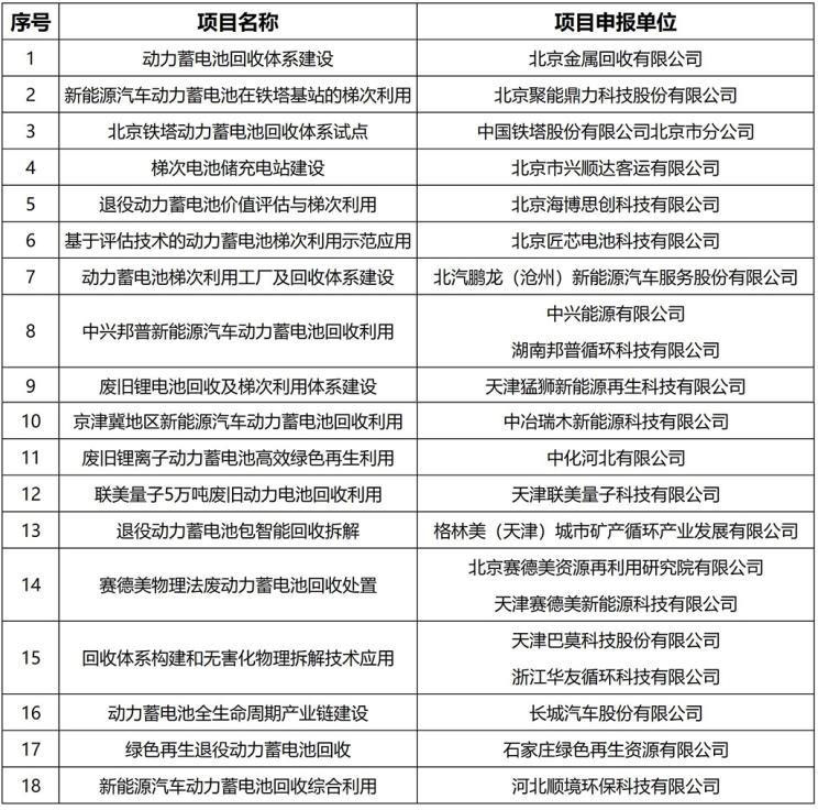 隨著新能源汽車推廣量不斷增加,動力電池回收正在變得越來越迫切。近日,北京、天津、河北共同組織開展了,京津冀地區(qū)新能源汽車動力電池回收利用試點示范項目的遴選,共有18個動力電池回收及再利用項目入選。