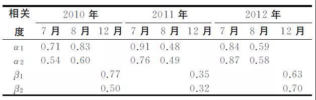通過梳理廣東省34個氣象站2010~2012年的氣溫數(shù)據(jù),分析氣溫和日負荷率、日最小負荷率的相關(guān)性。在排除節(jié)假日、周末等因素的影響后,發(fā)現(xiàn)7、8、12月的日負荷率及日最小負荷率與氣溫的相關(guān)程度一般高于其他月份(表3)。其中,7、8月的日負荷率與日平均氣溫的相關(guān)度α1較高,而最小日負荷率與日平均最低氣溫的相關(guān)度α2較高;12月的日負荷率及日最小負荷率與日平均最高氣溫有一定的相關(guān)性,相關(guān)度為β1、β2。由表3可知,7、8、12月的日負荷率及日最小負荷率與氣溫的相關(guān)度基本都高于0.5,為顯著相關(guān)。其中2011年8月受錯峰影響,相關(guān)度有所下降;12月受寒潮影響,月內(nèi)氣溫起伏較大,導致相關(guān)度較低。一般來說,8月的氣溫越高,負荷水平越高,特別是晚間的負荷水平增加明顯,使得日負荷率和日最小負荷率較高;12月溫度較低,會使高峰時段降溫負荷有所增加,日最大負荷相對升高,導致日負荷率和日最小負荷率降低。