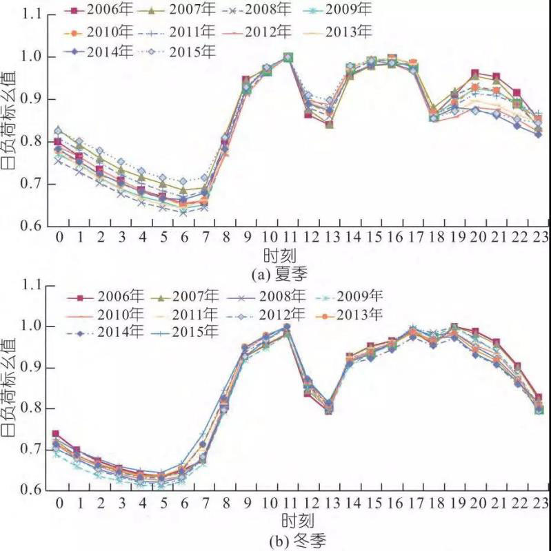 2006~2015年廣東電網(wǎng)夏季與冬季典型日負荷曲線見圖3。由圖3可知,廣東電網(wǎng)夏季和冬季典型日負荷曲線在各年份呈現(xiàn)的形狀一致性很高;夏、冬兩季日負荷曲線形狀基本一致,每天存在三峰三谷,兩者僅晚上負荷曲線略有不同。夏季典型日最高峰通常出現(xiàn)在11:00左右,低谷負荷出現(xiàn)在早上6:00 左右,日最小負荷率在0.63~0.71之間。冬季典型日負荷早高峰統(tǒng)一出現(xiàn)在11:00左右,若溫度較低,由于晚間保溫負荷的增加,晚高峰為全天高峰;低谷負荷出現(xiàn)在凌晨5:00左右,同時也是日最小負荷,日最小負荷率在0.61~0.65之間,低于夏季典型工作日最小負荷率。