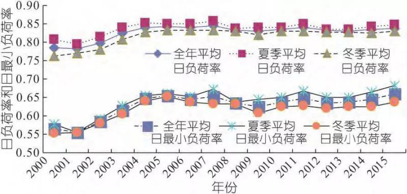 2.2 年平均日負荷率、日最小負荷率日負荷率是日平均負荷與日最大負荷的比值,反映負荷一天內(nèi)的平穩(wěn)程度;日最小負荷率是日最小負荷與日最大負荷的比值,反映負荷一天內(nèi)的變化幅度。2000~2015年廣東電網(wǎng)年平均日負荷率、年平均日最小負荷率見圖2。由圖2可知,近5年來廣東電網(wǎng)全年平均日負荷率維持在0.83~0.84,平均日最小負荷率在0.64~0.66之間。夏季與冬季平均日負荷率變化趨勢相同,僅變化程度略有差異。夏季因受制冷負荷的影響,日負荷率與日最小負荷率均稍高于冬季。