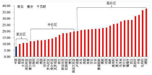 中價(jià)區(qū):電價(jià)為10~15美分,包括盧森堡(14.6美分)、多數(shù)東歐國(guó)家、韓國(guó)(10.7美分)、美國(guó)(10.5美分)等12個(gè)國(guó)家。美國(guó)頁(yè)巖氣資源豐富且開采成本低,東歐國(guó)家電力基礎(chǔ)設(shè)施相對(duì)落后。