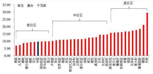 其中,高于8美分的有西班牙(14.8美分)、意大利(10.0美分)、英國(guó)(9.3美分)等7個(gè)國(guó)家;5~8美分的有韓國(guó)(7.2美分)、法國(guó)(7.3美分)、德國(guó)(6.6美分)、美國(guó)(6.2美分)、中國(guó)(5.3美分)等19個(gè)國(guó)家;低于5美分的有挪威(4.7美分)、丹麥(4.3美分)等11個(gè)國(guó)家。