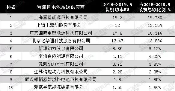 氫燃料電池系統(tǒng)供應商2018年-2019年6月的裝機總功率