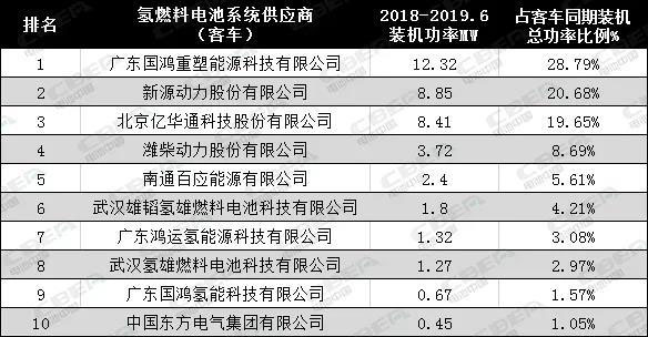 氫燃料電池系統(tǒng)供應商2018年-2019年6月的客車裝機功率