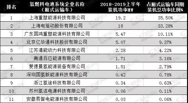 據(jù)動力電池應用分會研究部統(tǒng)計,2018年-2019年上半年已投產(chǎn)的箱式運輸車的裝機功率為54.09MW,參與氫燃料電池系統(tǒng)供應的廠商共計11家。贏得市場份額最多的前三甲分別是上海重塑、上海電驅(qū)動和廣東國鴻重塑。