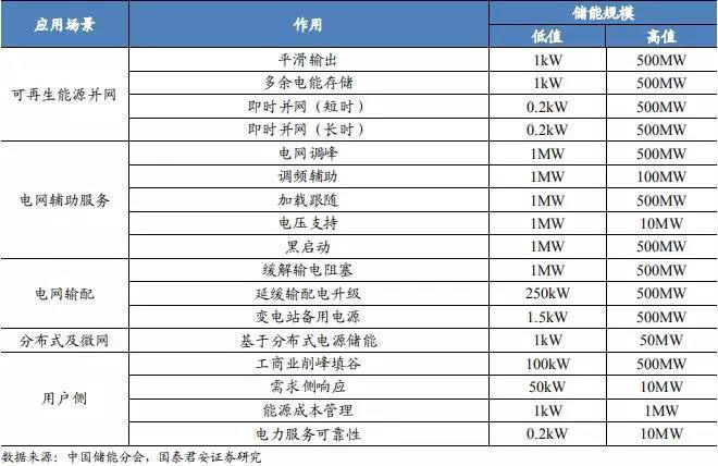 表 4:儲(chǔ)能應(yīng)用場(chǎng)景廣泛,包括電網(wǎng)側(cè)、可再生能源并網(wǎng)、用戶側(cè)等方面
