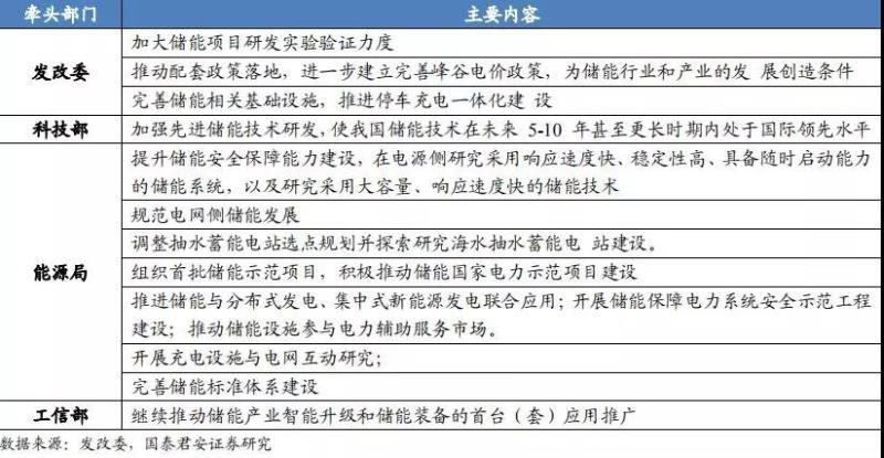 2019-2020 年行動(dòng)計(jì)劃出臺(tái),各部門(mén)各司其職保障儲(chǔ)能產(chǎn)業(yè)化應(yīng)用。2017年發(fā)改委等五部門(mén)聯(lián)合發(fā)布《關(guān)于促進(jìn)儲(chǔ)能技術(shù)與產(chǎn)業(yè)發(fā)展的指導(dǎo)意見(jiàn)》,其中明確提到在十三五期間儲(chǔ)能產(chǎn)業(yè)發(fā)展進(jìn)入商業(yè)化初期,十四五期間儲(chǔ)能儲(chǔ)能產(chǎn)業(yè)規(guī)模化發(fā)展。2019 年 7 月為進(jìn)一步的貫徹落實(shí)該項(xiàng)指導(dǎo)意見(jiàn),發(fā)改委等四部門(mén)發(fā)布 2019-2020 年行動(dòng)計(jì)劃,其中對(duì)發(fā)改委、科技部、工信部、能源局的工作任務(wù)都做了詳細(xì)部署,進(jìn)一步推進(jìn)我國(guó)儲(chǔ)能技術(shù)與產(chǎn)業(yè)健康發(fā)展。