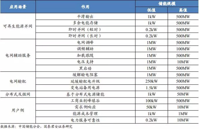 儲(chǔ)能主要應(yīng)用于電網(wǎng)輸配與輔助服務(wù)、可再生能源并網(wǎng)、分布式及微網(wǎng)以及用戶側(cè)各部分。在電網(wǎng)輸配和輔助服務(wù)方面,儲(chǔ)能技術(shù)主要作用分別是電網(wǎng)調(diào)峰、加載以及啟動(dòng)和緩解輸電阻塞、延緩輸電網(wǎng)以及配電網(wǎng)的升級(jí);在可再生能源并網(wǎng)方面,儲(chǔ)能主要用于平滑可再生能源輸出、吸收過(guò)剩電力減少“棄風(fēng)棄光”以及即時(shí)并網(wǎng);在分布式及微網(wǎng)方面, 儲(chǔ)能主要用于穩(wěn)定系統(tǒng)輸出、作為備用電源并提高調(diào)度的靈活性;在用戶側(cè),儲(chǔ)能主要用于工商業(yè)削峰填谷、需求側(cè)響應(yīng)以及能源成本管理。