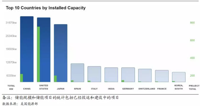 中國(guó)儲(chǔ)能裝機(jī)規(guī)模位列全球第一,美國(guó)、日本分列二三位。根據(jù)中關(guān)村儲(chǔ)能技術(shù)聯(lián)盟數(shù)據(jù)統(tǒng)計(jì),中國(guó)裝機(jī)規(guī)模達(dá)到 31.3GW,占全球裝機(jī)總量17.3%,裝機(jī)規(guī)模位列全球第一。同樣的在美國(guó)能源部的統(tǒng)計(jì)中我們也可以看到從裝機(jī)規(guī)模來(lái)看中國(guó)位列全球第一(美國(guó)能源部統(tǒng)計(jì)的裝機(jī)規(guī)模包括已經(jīng)投運(yùn)的項(xiàng)目和在建的項(xiàng)目),美國(guó)裝機(jī)規(guī)模位列全球第二,但其儲(chǔ)能項(xiàng)目數(shù)量位列第一。日本市場(chǎng)盡管其國(guó)土面積較小,但其整體裝機(jī)規(guī)模同樣在 30GW 左右,位列全球第三;西班牙、意大利、印度、德國(guó)、瑞士、法國(guó)、韓國(guó)分別四至十名,但與前三名相比裝機(jī)規(guī)模存在顯著差距。