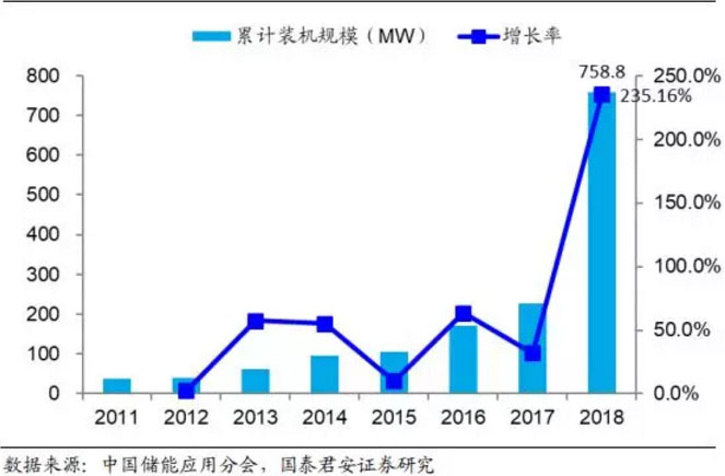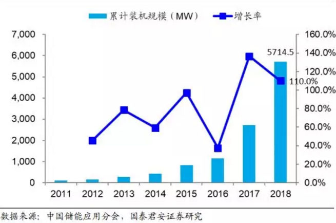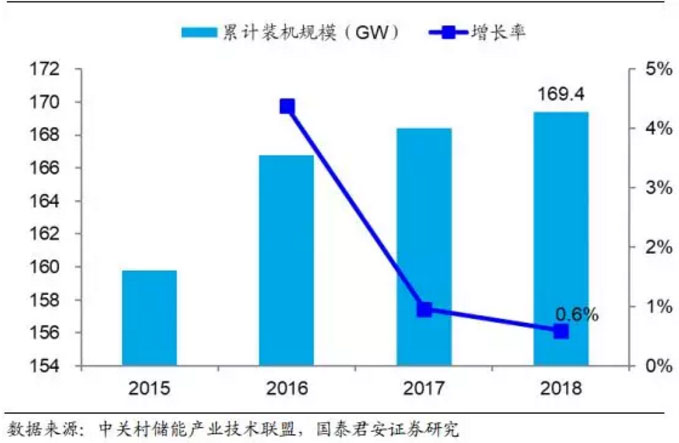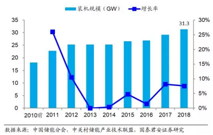 儲(chǔ)能產(chǎn)業(yè)興起較早且發(fā)展穩(wěn)定,截止 2010 年底儲(chǔ)能累計(jì)裝機(jī)規(guī)模已經(jīng)達(dá)到 135GW;2010-2015 年期間的由于受到整體經(jīng)濟(jì)低迷影響,整體裝機(jī)量增速放緩, 截止 2015 年累計(jì)裝機(jī)規(guī)模達(dá)到 144.8GW;2016-2018 年由于受到成本下降和政策推動(dòng)的雙重刺激,儲(chǔ)能行業(yè)快速發(fā)展,截止 2018 年底累計(jì)裝機(jī)規(guī)模達(dá)到 179.1GW。