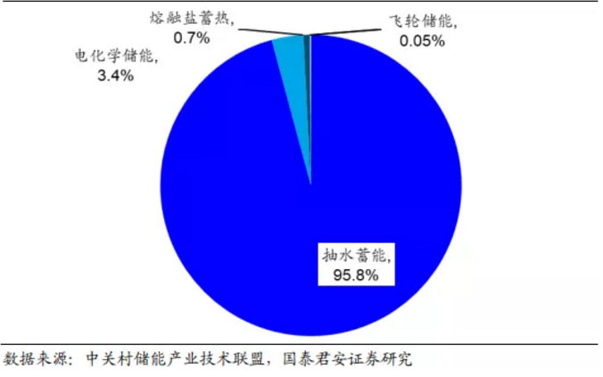 中國(guó)市場(chǎng)與全球類(lèi)似,抽水蓄能占據(jù)主導(dǎo)地位。在儲(chǔ)能裝機(jī)的類(lèi)型分布中,我國(guó)呈現(xiàn)與全球類(lèi)似的特點(diǎn),根據(jù) CNESA 數(shù)據(jù)統(tǒng)計(jì)顯示,截止 2018年底我國(guó)儲(chǔ)能整體裝機(jī)中抽水蓄能占比達(dá)到 95.8%,電化學(xué)儲(chǔ)能與其他儲(chǔ)能方式共存,其中電化學(xué)儲(chǔ)能市場(chǎng)占比為 3.4%,熔融鹽蓄熱儲(chǔ)能市場(chǎng)占比 0.7%,而飛輪儲(chǔ)能,壓縮空氣儲(chǔ)能市場(chǎng)占比均不足 0.1%。