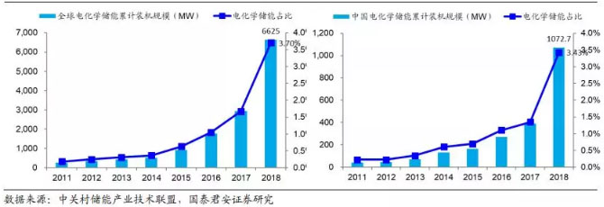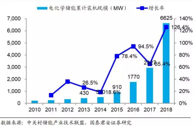 電化學(xué)儲(chǔ)能是儲(chǔ)能市場(chǎng)保持增長(zhǎng)的新動(dòng)力。無(wú)論是從全球還是中國(guó)的裝機(jī)情況來(lái)看,2018 年都可以說(shuō)是電化學(xué)儲(chǔ)能的元年,亦或是集中爆發(fā)的一年。從全球角度來(lái)看,2018 年電化學(xué)儲(chǔ)能裝機(jī)規(guī)模達(dá)到 6625MW,同比增長(zhǎng) 126.4%;占儲(chǔ)能市場(chǎng)裝機(jī)規(guī)模比重從 2017 年 1.67%提升到 2018 年的 3.70%。從中國(guó)市場(chǎng)來(lái)看,2018 年我國(guó)電化學(xué)儲(chǔ)能裝機(jī)規(guī)模達(dá)到1072.7MW,同比增長(zhǎng) 175.2%;占我國(guó)儲(chǔ)能市場(chǎng)裝機(jī)估摸比重從 2017 年1.35%提升到 2018 年的 3.43%。我們認(rèn)為隨著電化學(xué)儲(chǔ)能技術(shù)的不斷改進(jìn),電化學(xué)儲(chǔ)能系統(tǒng)的制造成本和維護(hù)成本不斷下降、儲(chǔ)能設(shè)備容量及壽命不斷提高,電化學(xué)儲(chǔ)能將得到大規(guī)模的應(yīng)用,成為中國(guó)儲(chǔ)能產(chǎn)業(yè)新的發(fā)展趨勢(shì)。根據(jù)中關(guān)村儲(chǔ)能產(chǎn)業(yè)技術(shù)聯(lián)盟數(shù)據(jù)預(yù)測(cè),到 2020 年我國(guó)電化學(xué)儲(chǔ)能市場(chǎng)占比將進(jìn)一步從 2018 年的 3.43 提高到 7.3%。
