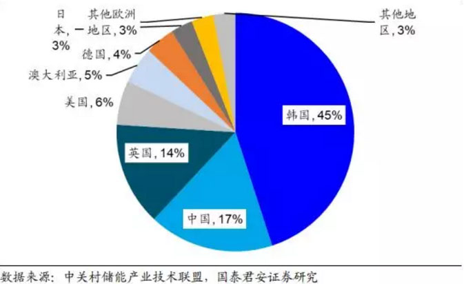 圖 16:韓國(guó)位列 2018 年全球新增電化學(xué)儲(chǔ)能市場(chǎng)裝機(jī)規(guī)模第一