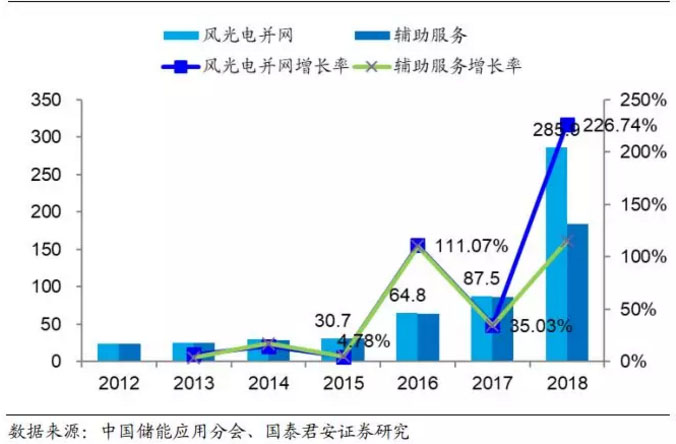 鋰電儲(chǔ)能技術(shù)在可再生能源并網(wǎng)和電網(wǎng)側(cè)裝機(jī)增長(zhǎng)顯著。在 2012 年, 鋰電儲(chǔ)能技術(shù)在風(fēng)光電并網(wǎng)和輔助服務(wù)的累計(jì)裝機(jī)量?jī)H為 23.9MW、23.7MW。自 2016 年起,全國(guó)各地方儲(chǔ)能產(chǎn)業(yè)政策不斷出爐,推動(dòng)了儲(chǔ)能產(chǎn)業(yè)的快速發(fā)展,鋰電儲(chǔ)能在風(fēng)光電并網(wǎng)和電力輔助服務(wù)上裝機(jī)量攀升,2018 年累計(jì)裝機(jī)同比增速高達(dá) 226.7%、115.1%,累計(jì)裝機(jī)量分別為285.9MW、184.3MW。目前仍有大量風(fēng)光發(fā)電站和熱電廠未裝備有調(diào)峰調(diào)頻儲(chǔ)能設(shè)備,鋰電儲(chǔ)能技術(shù)在風(fēng)光電并網(wǎng)和輔助服務(wù)側(cè)存在廣闊的市場(chǎng)。