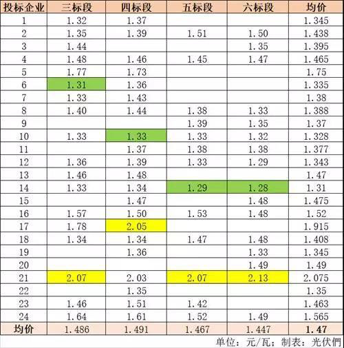 此次一共24家企業(yè)參與EPC總承包的投標,四個標段平均報價1.47元/瓦,最低報價1.28元/瓦,最高報價2.13元/瓦,中間報價為1.41元/瓦,不同企業(yè)報價差異較大。