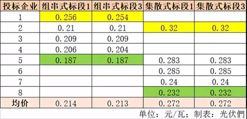 同日,該項目逆變器招標開標,分為組串式逆變器和集散式逆變器,一共8家企業(yè)參與投標,其中組串式逆變器最低報價0.187元/瓦,最高報價0.256元/瓦;集散式逆變器最低報價0.232元/瓦,最高報價0.32元/瓦。具體開標價格如下: