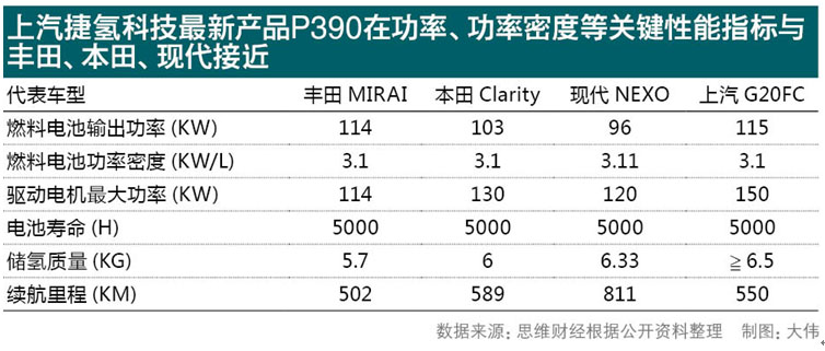 如果說億華通走的是一條“技術(shù)找資金”的道路,那上汽則恰好相反。在與同濟(jì)等方合作之后,上汽始終謀求自主掌控。2006年,上汽成立燃料電池事業(yè)部,此后無論市場環(huán)境如何變動(dòng)、內(nèi)部架構(gòu)如何調(diào)整,團(tuán)隊(duì)仍然保持。2018年,上汽將燃料電池研發(fā)團(tuán)隊(duì)獨(dú)立,成立捷氫科技,其最新產(chǎn)品P390在功率、功率密度等關(guān)鍵性能指標(biāo)已和豐田、現(xiàn)代接近。