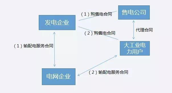 新電改模式下,發(fā)電企業(yè)與售電公司或大工業(yè)電力用戶之間的購售電合同、發(fā)電企業(yè)或電力用戶與電網(wǎng)企業(yè)之間的輸配電服務(wù)合同、售電公司與電力用戶之間的代理合同等多個合同關(guān)系組合構(gòu)成一個完整的電力交易關(guān)系。