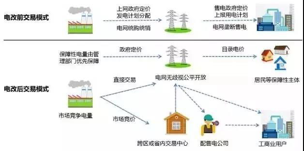 電改實施后,計劃發(fā)用電部分交易模式與電網(wǎng)企業(yè)統(tǒng)購統(tǒng)銷模式一致,市場交易部分可以有兩種交易模式,一是發(fā)電企業(yè)與大用戶直接交易,二是發(fā)電企業(yè)售電給售電公司,售電公司再售電給用戶,電網(wǎng)企業(yè)承擔(dān)輸配電服務(wù),從統(tǒng)購統(tǒng)銷模式中的“電力批發(fā)商”角色轉(zhuǎn)換為“電力承運人”角色。