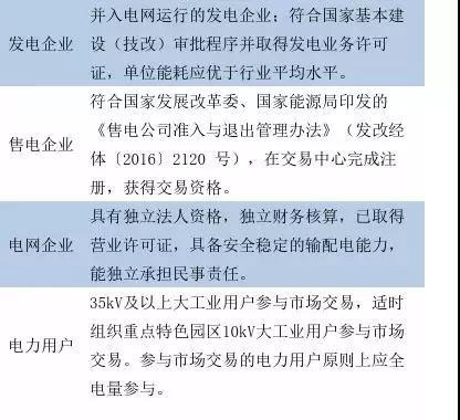 新電改后參加電力交易的市場主體主要包括四類:發(fā)電企業(yè)、售電公司、電網(wǎng)企業(yè)以及電力用戶。由于各個省分對于市場主體的具體要求不完全一致,故下面筆者將以《2018年廣西電力市場交易實施方案和實施細則》(2019年實施方案和細則尚未頒布)中對各市場主體的規(guī)定為例作簡要介紹。