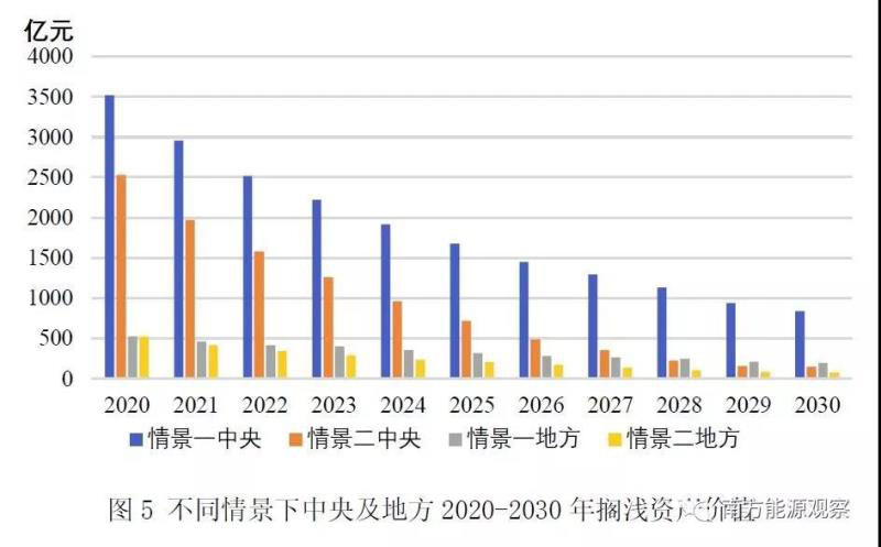 2、對中央及地方2020-2030年間的擱淺資產(chǎn)規(guī)模進(jìn)行量化分析。采取積極的供給側(cè)改革措施后,2020-2030年的中央擱淺損失由2526億元銳減至144億元,地方擱淺損失由520億元銳減至76億元;以2030年為擱淺年份,不同情景下中央的擱淺資產(chǎn)價(jià)值分別為836億元和144億元,地方的擱淺資產(chǎn)價(jià)值分別為196億元和76億元。一方面財(cái)政稅收減少,待業(yè)人員增多,需解決大量人員安置問題;另一方面影響國家投資政策的制定,對于新建煤電項(xiàng)目,需要考慮擱淺風(fēng)險(xiǎn),投資考察環(huán)節(jié)增多,審批步驟繁瑣,增加了無謂的行政成本。
