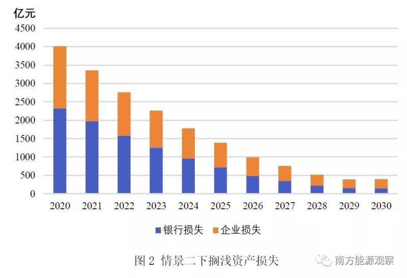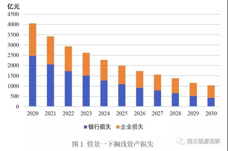 第二,新建機(jī)組造成老機(jī)組的擠出,老機(jī)組面臨較高的擱淺風(fēng)險(xiǎn)。若以2020年為擱淺年份,當(dāng)年新建成的機(jī)組擠壓老機(jī)組的市場空間,使其提前退出市場,老機(jī)組剩余壽命期內(nèi)資產(chǎn)價(jià)值即為擱淺價(jià)值,包含了擠出銀行擱淺價(jià)值和擠出企業(yè)擱淺價(jià)值,共計(jì)4041億元。以2020-2030各年為擱淺年份,由于擠出機(jī)組大部分為運(yùn)行多年的機(jī)組,而服役滿30年的機(jī)組擱淺價(jià)值清零,擠出機(jī)組的擱淺價(jià)值不斷減少。但2030年當(dāng)年的擱淺價(jià)值仍將達(dá)1032億元。