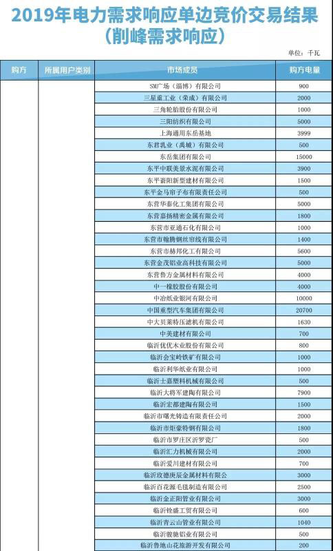 山東電力交易中心于7月22日-23日組織開展了山東省2019年電力需求響應單邊競價交易,按照《關于開展2019年電力需求響應工作的通知》(魯能源電力字〔2019〕176號)和《2019年電力需求響應單邊競價交易公告》(通知〔2019〕131號)有關要求,國網(wǎng)山東省電力公司根據(jù)響應方在山東省電力需求側管理平臺申報情況對響應負荷進行了校核,確認555家電力用戶達成削峰需求響應2103952千瓦,統(tǒng)一出清價格30元/千瓦;257家電力用戶達成填谷需求響應827371千瓦,統(tǒng)一出清價格30元/千瓦。現(xiàn)將2019年電力需求響應單邊競價交易結果(詳見下表)予以發(fā)布。