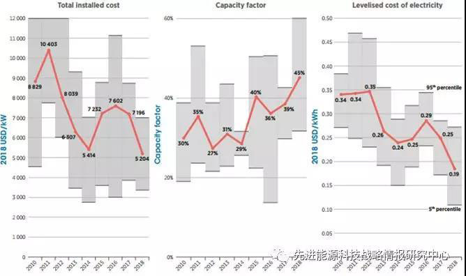 圖3b 2010-2018年間海上風(fēng)電全球加權(quán)平均裝機成本(單位:美元/千瓦)、容量因子和LCOE(單位:美元/千瓦時)變化態(tài)勢