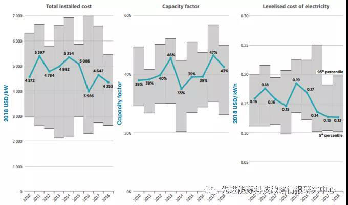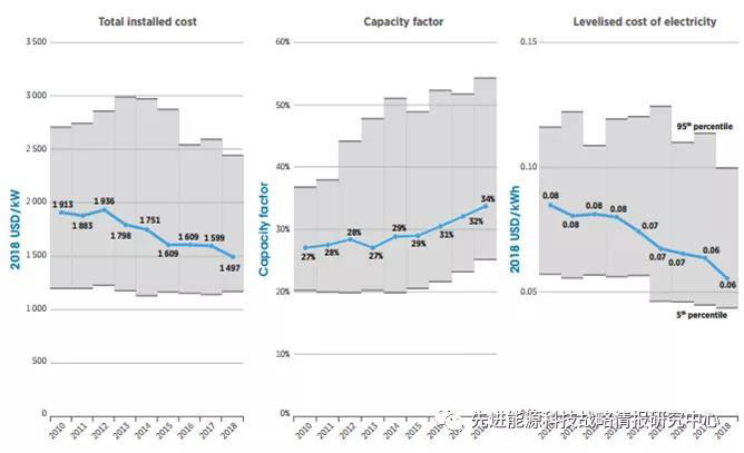 圖2 2010-2018年間CSP全球加權(quán)平均裝機成本(單位:美元/千瓦)、容量因子和LCOE(單位:美元/千瓦時)變化態(tài)勢