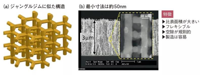 然而,IMEC也有表示在五年內(nèi)實現(xiàn)2~3 C的快速充電。2019年3月,該公司公布了其中一個技術(shù)(圖4)。它是一種“納米網(wǎng)狀電極”(IMEC),具有常規(guī)的氣隙,最小尺寸約50nm,非常小,具有多孔柔韌的特性?!斑@樣,即使在快速充電期間也可以抑制金屬Li負極的枝晶”(IMEC)但是,沒有公開原因的細節(jié)。
