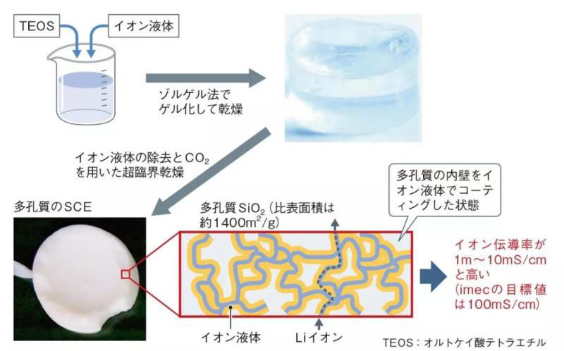 制造過程概要如下(圖3)。首先,將稱為TEOS ?的 Si基材料在離子液體中分散,加入水(水解),形成膠凝。除水后,采用CO2進行超臨界干燥?。然后它變成一種非常輕的海綿狀固體材料,稱為“氣凝膠”。這是上述電解質(zhì)從液體變成固體的過程。
