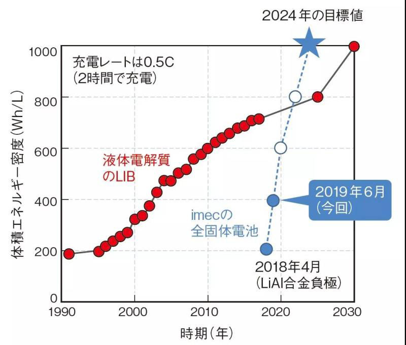 注1)IMEC表示,為了實現(xiàn)1000 Wh /L的體積能量密度,將一次通過開發(fā)以下步驟去實現(xiàn)(1)使用汽車電池中使用的高電位材料(NMC,NCA等)作為正極活性材料,(2)優(yōu)化電極結(jié)構(gòu),(3)減薄電解質(zhì)層厚度。