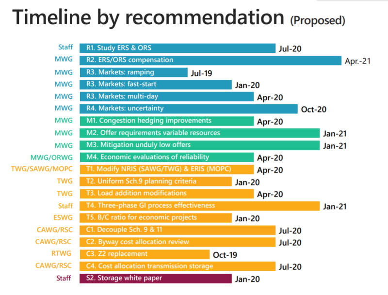 藍(lán)色項(xiàng)目涉及可靠性建議,綠色項(xiàng)目涉及能源市場,黃色項(xiàng)目涉及規(guī)劃和成本分配計(jì)劃,紫色項(xiàng)目涉及戰(zhàn)略建議。