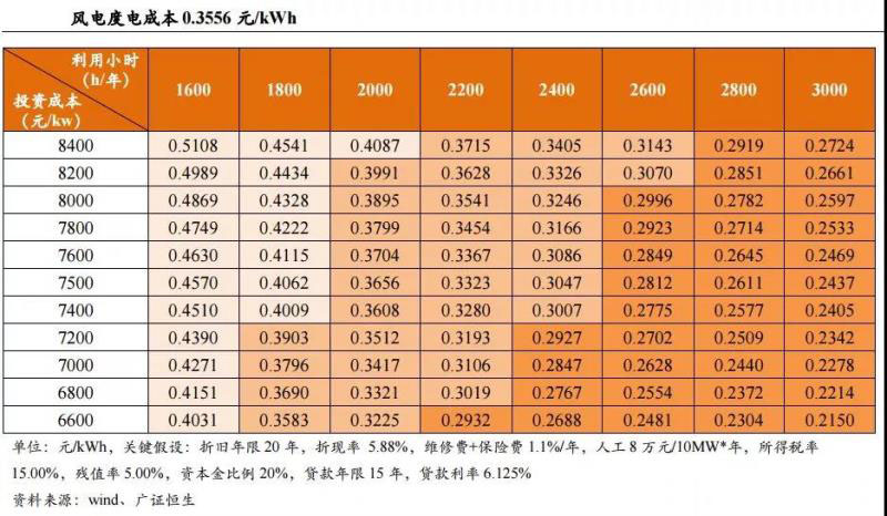 2018年全國風電平均利用小時數(shù)2095小時,考慮到7%的棄風率,實際平均利用小時數(shù)1948小時,以7500元/kW投資成本測算,目前全國風電度電成本約為0.3656元/kWh,低于光伏發(fā)電度電成本。